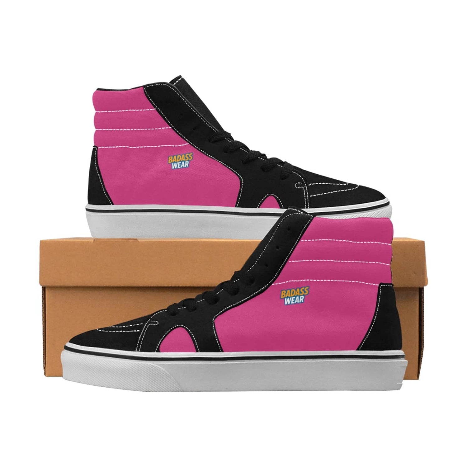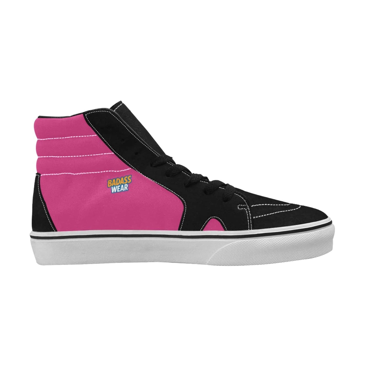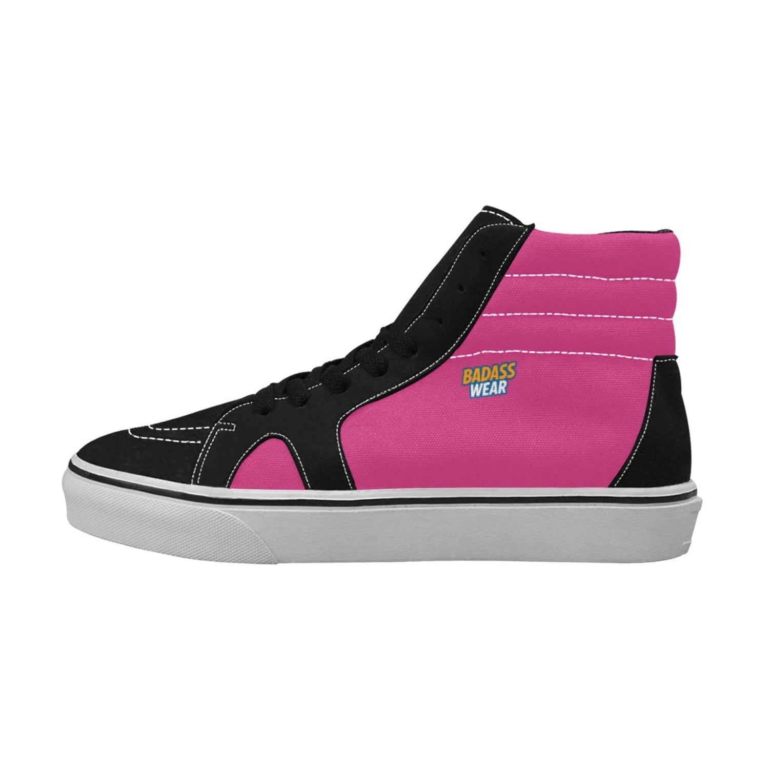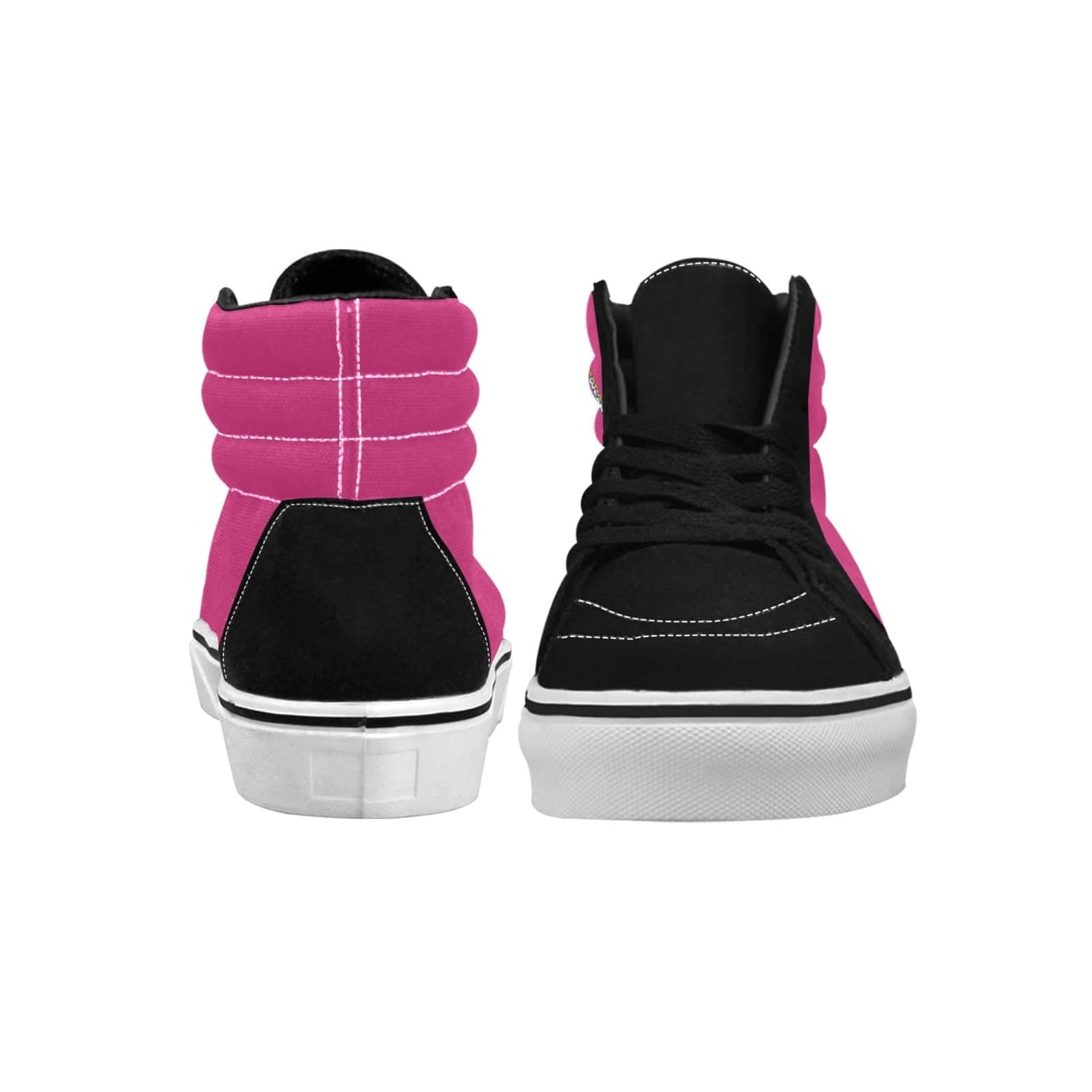 Make a bold statement with these black and pink high-top skate shoes. Combining a vibrant design with durable construction, they are perfect for skateboarding or adding a pop of color to your everyday look.