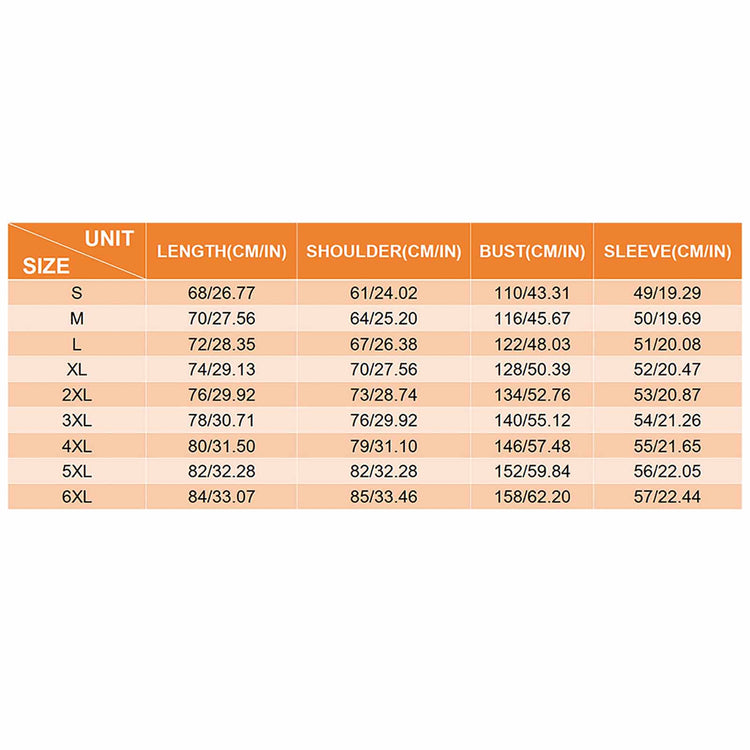 • Erhältlich in den Größen S, M, L, XL, 2XL, 3XL, 4XL, 5XL und 6XL. Bitte entnehmen Sie der untenstehenden Größentabelle die passende Größe.