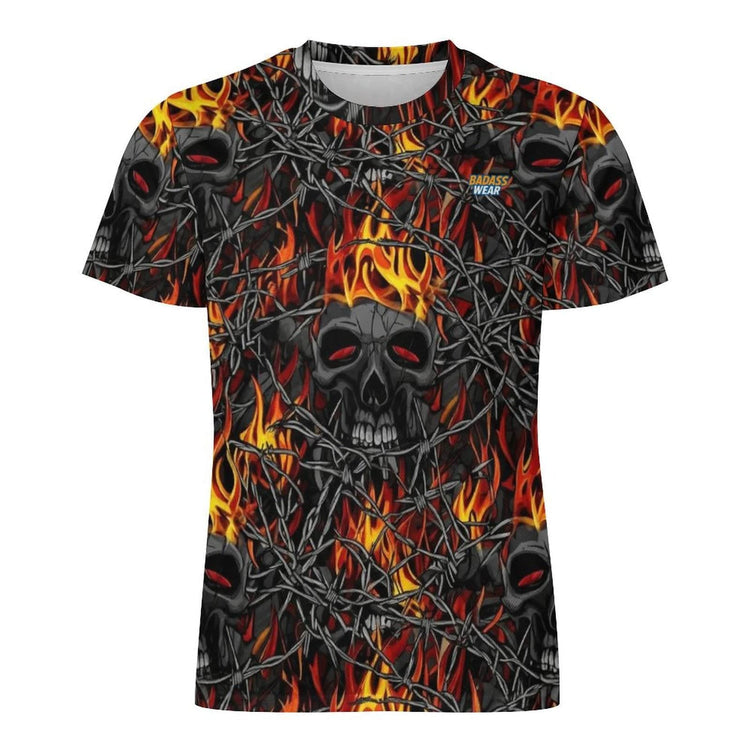 Τολμήστε να είστε διαφορετικοί με το Μπλούζα με αγκράφα και μετάξι από πάγο, ένα σχέδιο τόσο προκλητικό όσο και άνετο. Αυτό το μπλουζάκι διαθέτει ένα έντονο, παντού μοτίβο από σκούρα κρανία με λαμπερά κόκκινα μάτια, μπερδεμένα σε απειλητικό συρματόπλεγμα και περιτριγυρισμένα από πύρινες φλόγες.
