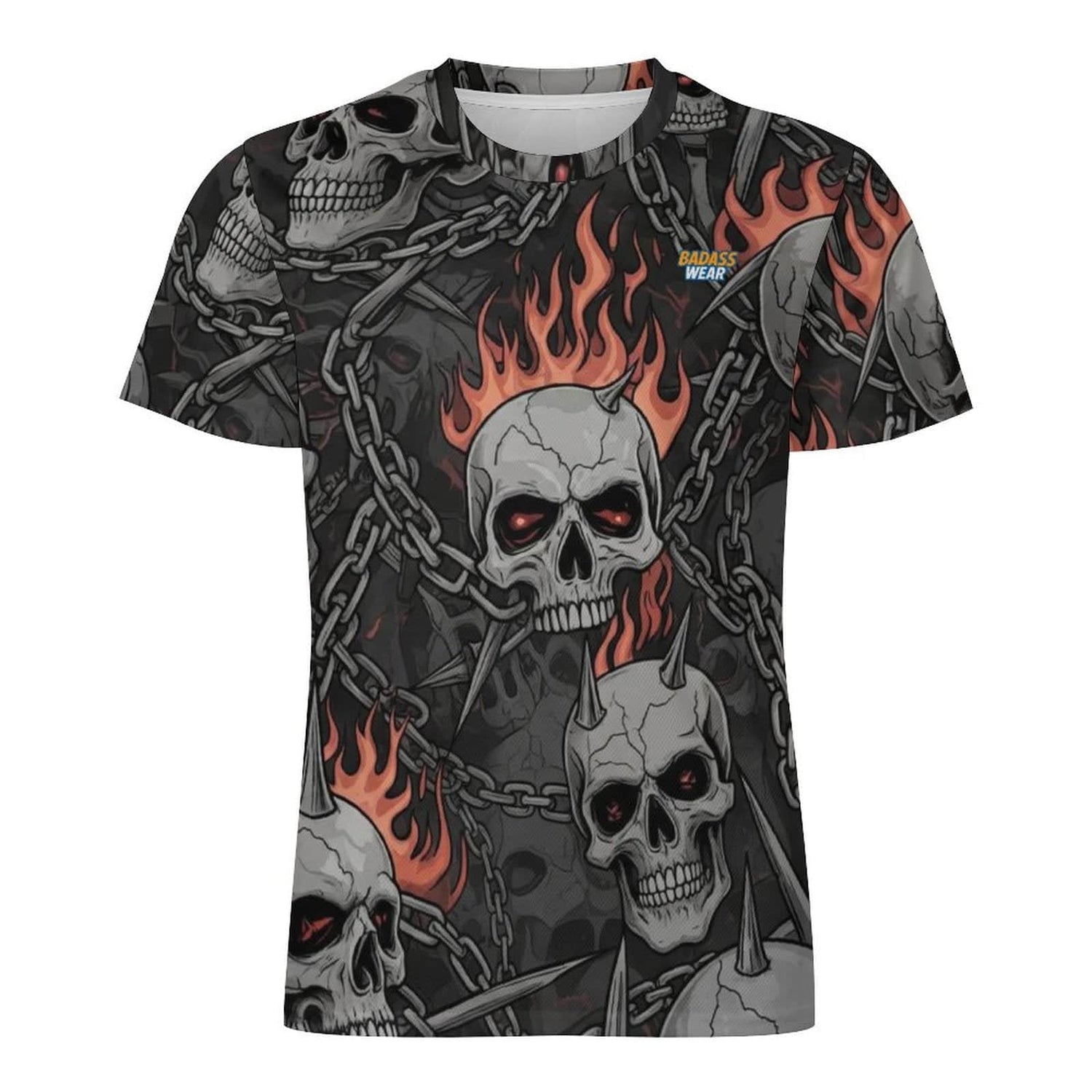 Bold All-Over Design: Features a striking, custom print of flaming and spiked skulls with chains for a look that commands attention.
