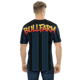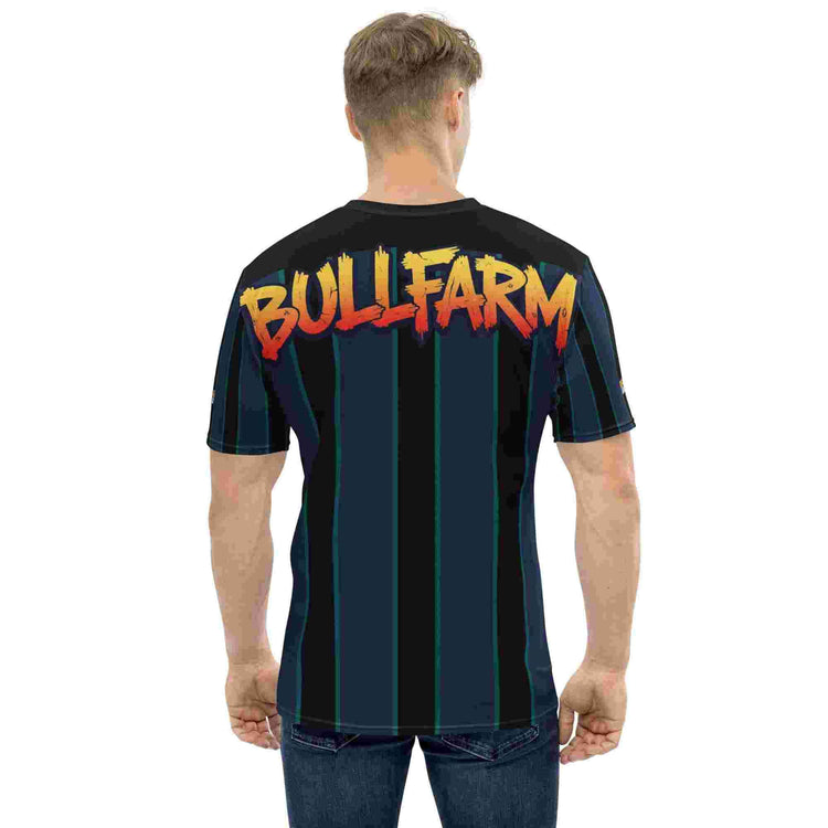 T-shirtens tryck är en slående kombination av klassiskt och modernt. Skjortan har vertikala, mörkblå och svarta ränder, accentuerade med tunna, turkosa linjer. Detta grafiska mönster skapar en skarp och atletisk look. Den snygga "Badass Wear"-logotypen finns på vänster bröst och höger ärm, medan ryggen pryds av en djärv och distinkt "BULLFARM"-text med en flamliknande, orangegul nyans. Den svarta panelen på övre delen av ryggen och axlarna ger skjortan ett modernt och färdigt utseende.